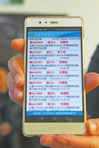11月28日下午2時許,在滎陽市桃賈路樓李段,執(zhí)法人員將一輛大卡車攔截下來,當(dāng)即作出處罰決定,依據(jù)的是大卡車駛過樓李路面動態(tài)稱重檢測系統(tǒng)和監(jiān)控攝像頭時,系統(tǒng)顯示該大卡車超載36%,其超載信息通過監(jiān)控裝置實時傳輸?shù)街登诮痪氖謾C中。